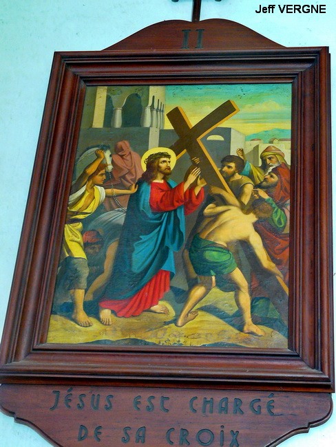 Après les statues de la Ste Vierge et de St Joseph (ne faut-il pas que la mère soit auprès de son Fils ?) les images que l’on trouve dans toutes les églises sont celles du Chemin de la Croix.