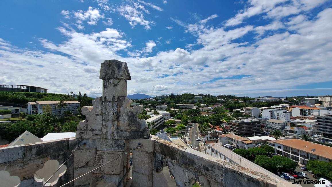 Les travaux continuèrent après les fêtes que nous venons de raconter et la Cathédrale prit bientôt cet aspect monumental que nous lui voyons. Il avait été question d’établir des flèches sur les clochers, et nous avons des photographies de plans où elles sont dessinées. Mais la difficulté de l’entreprise, et surtout la prévision de cyclones ont fait ajourner sine die cette construction. Elle a été remplacée par une balustrade de pierres taillées, qui est du plus heureux effet et donne aux deux tours de la Cathédrale un cachet de robustesse qu’une flèche eût enlevé. Les quatre petits clochetons qui surmontent les angles rompent la monotonie de la balustrade et font de l’ensemble une œuvre qui plaît par son harmonie et ses proportions. À les voir surtout, de la rue Frédéric Surleau qui passe au pied de l’esplanade, ces tours paraissent très hautes. Elles le sont beaucoup moins qu’on ne le croit, car elles n’ont que 25,75m, mais elles profitent de leur situation élevée.