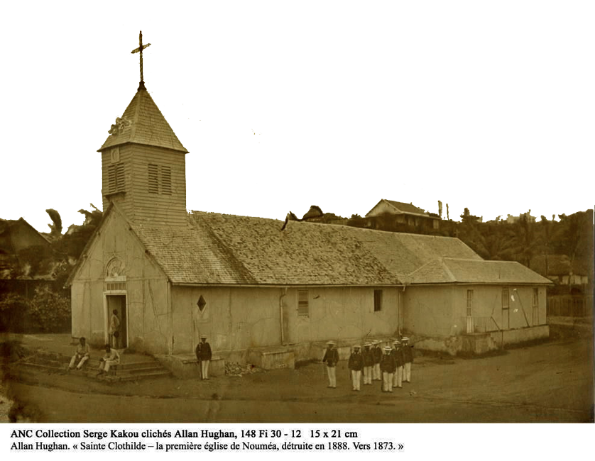 Peu de temps après, on commençait une église provisoire qui dura plus de trente ans. Elle était située dans la cour actuelle de l’internat des filles ; sa façade était tournée vers le fort Constantine, à la place duquel se trouve maintenant l’hôpital militaire, et elle était en bordure, le long de l’avenue Montebello, (actuellement en face du Laboratoire de chimie). Elle avait 30 m de long y compris la sacristie et 8 m de large. Sur la façade, il y avait un petit clocher carré et pointu, dans le genre du clocher de St-Louis, et dans ce clocher était une seule cloche, celle qui sert actuellement à appeler les Pères au confessionnal. Cette cloche qui venait d’un navire de l’État, a son histoire. Elle a été fondue en 1786, à Cherbourg, devant Louis XVI qui allait à ce moment, inaugurer la fameuse digue de Cherbourg. Cette première église de Nouméa fût bénite le jour de Pâques 1858.