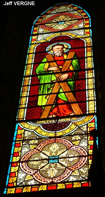 St Austremoine, premier évêque de Clermont-Ferrand, mort le 1er novembre 85, patron du Vicariat de la Nouvelle Calédonie. Dans un petit cartouche placé au bas du vitrail, on voit les armes de Monseigneur Douarre, le premier évêque de Calédonie.