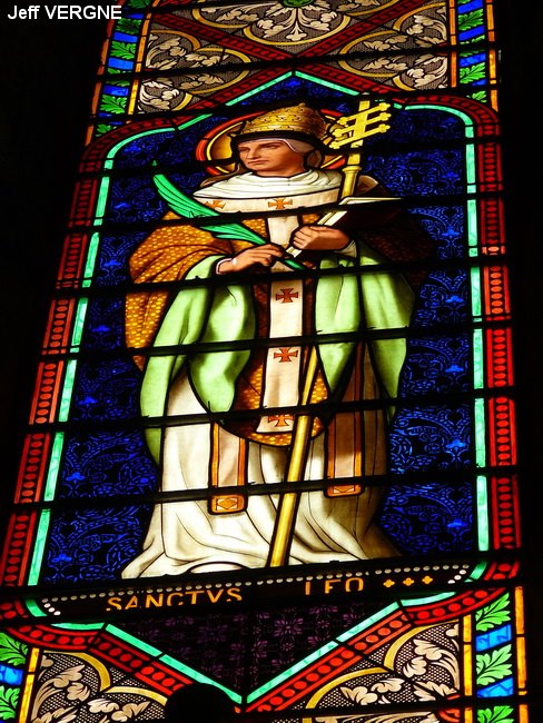 St Léon le Grand, le Pape qui, en 452, sous les murs de Rome, arrêta Attila, roi des Huns, le renvoya en Pannonie, et sauva ainsi la civilisation chrétienne d’une ruine irréparable. En dessous de ce vitrail, en hommage au Pape Léon XIII, qui régnait au moment de la construction de l’église, on a placé ses armes.